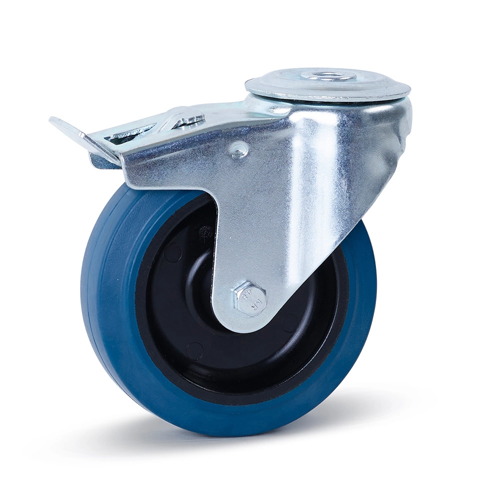 Blå elastiskt gummi svängbart hjul bromsat med centralt hål - 125mm - 180kg
