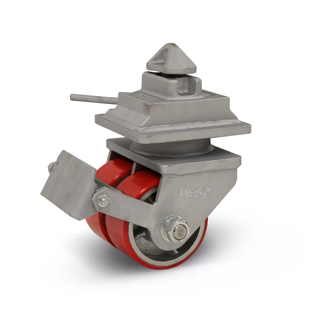 Detta bromsade containerhjul är idealiskt för tunga tillämpningar och ger extra stabilitet vid förflyttning av stora föremål. Hjulet har ett robust PU-däck och en kraftig hjulkärna av stål, vilket gör det motståndskraftigt mot tunga laster. Det är idealiskt för tuffa miljöer. Topplattan gör monteringen enkel och säkerställer en säker fastsättning på fraktcontainrar och andra tunga konstruktioner.