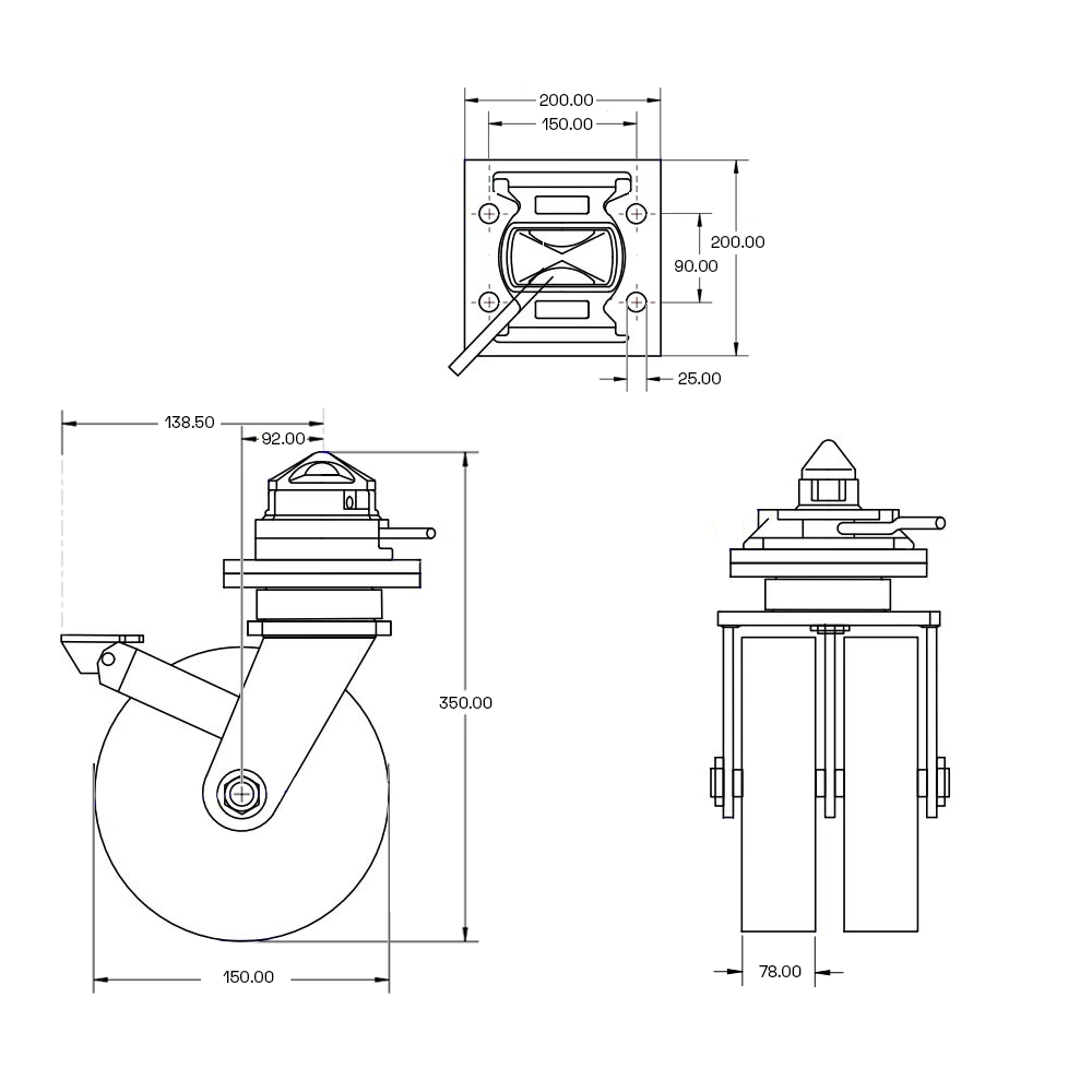 Bromsat containerhjul med topplatta, en diameter på 150 mm och en lastkapacitet på 1800 kg. Däcket är av PU och hjulkärnan är av stål.
