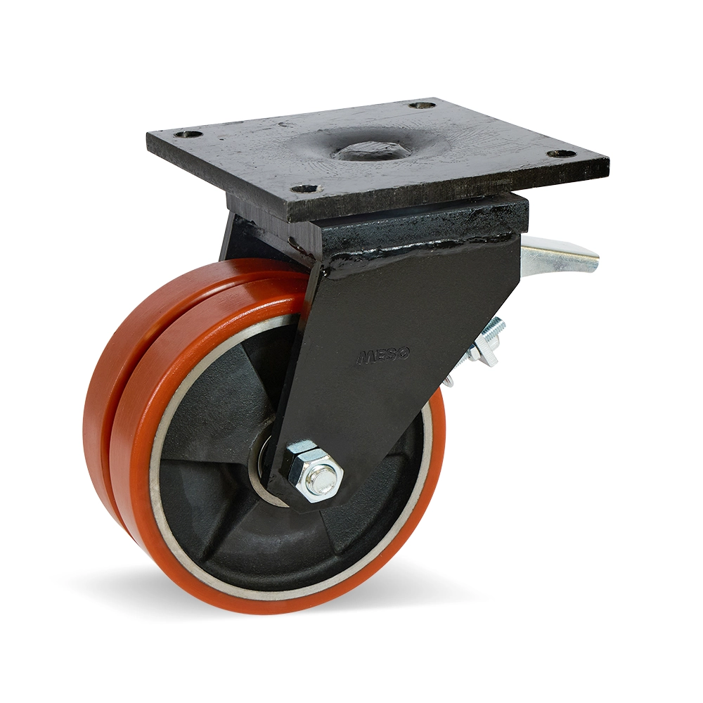 Dubbel PU extra kraftigt länkhjul bromsat med topplatta - 200mm - 2200kg