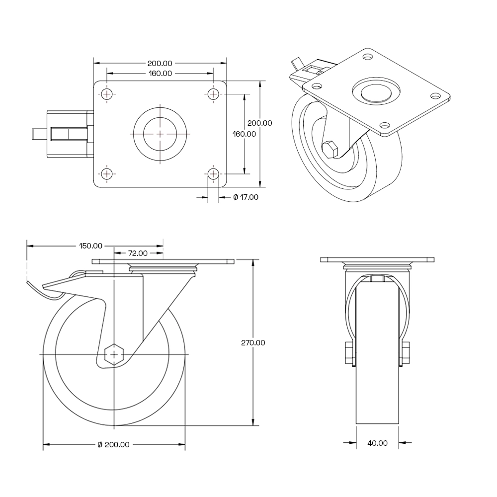 Svängbart länkhjul med broms, topplatta och dubbla PU-hjul. Bär upp till 2200 kg. Diameter: 200 mm.