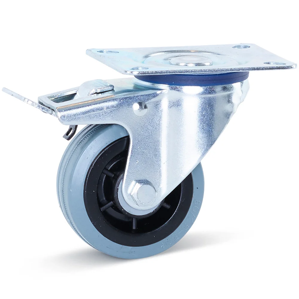 Svängbart hjul i grått gummi, bromsat med topplatta - 80mm - 60kg - Randig
