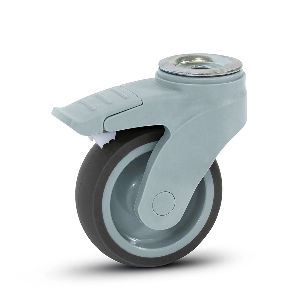 Svängbart hjul i grå plast, bromsat med bulthål - 100mm - 100kg