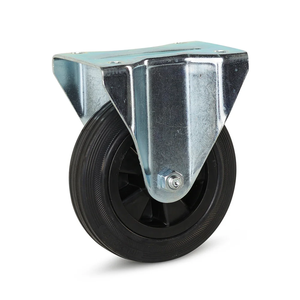Detta länkhjul av gummi har en topplatta, med vilken hjulet enkelt kan fästas med 4 bultar. Stationära länkhjul används bäst i kombination med 2 länkhjul eller 2 bromsade länkhjul, eftersom stationära länkhjul endast kan köras i en riktning.