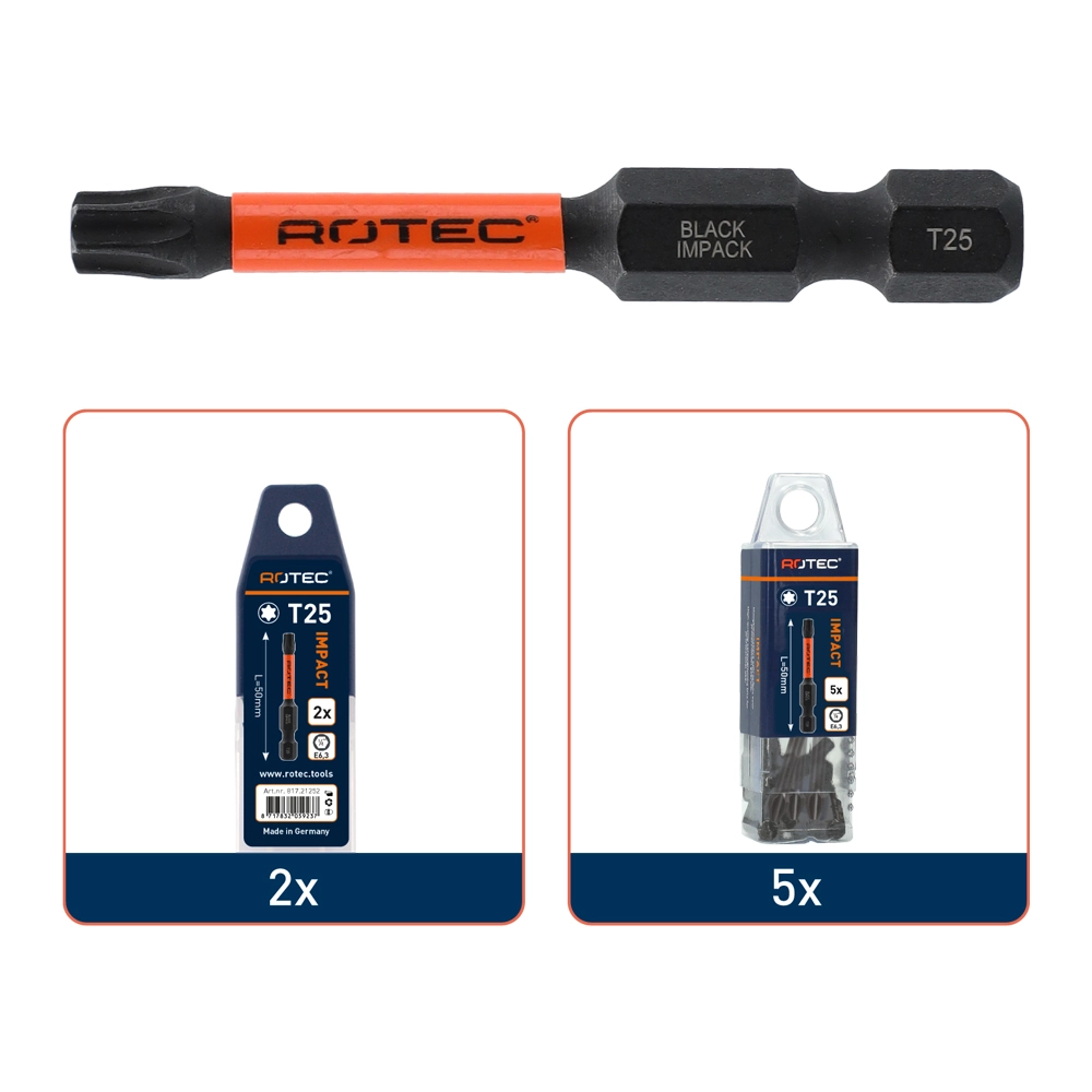 Skruvbitar för slagskruvdragare med svart slagfinish. Den anpassade optimala geometrin i kombination med härdat specialstål utgör grunden för en skruvbit med utmärkt hållbarhet. Ett idealiskt val för användning under mycket tuffa förhållanden.