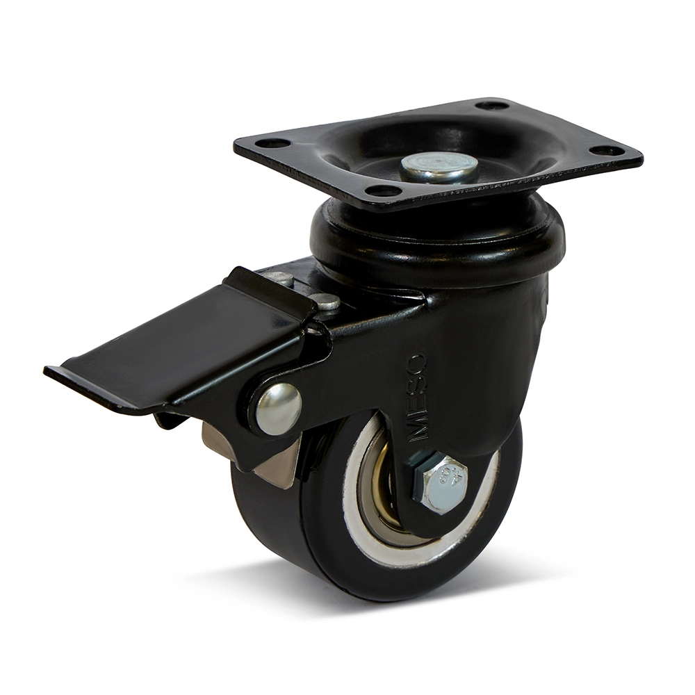 Svängbart PU-hjul 50 mm med broms och topplatta, hög lastkapacitet på 120 kg.