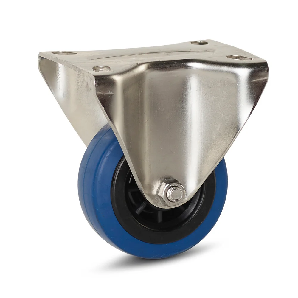 Det fasta hjulet har en topplatta som hjulet enkelt kan fästas på med 4 bultar, eller så kan du använda svetsglidplattor i rostfritt stål för detta ändamål.
