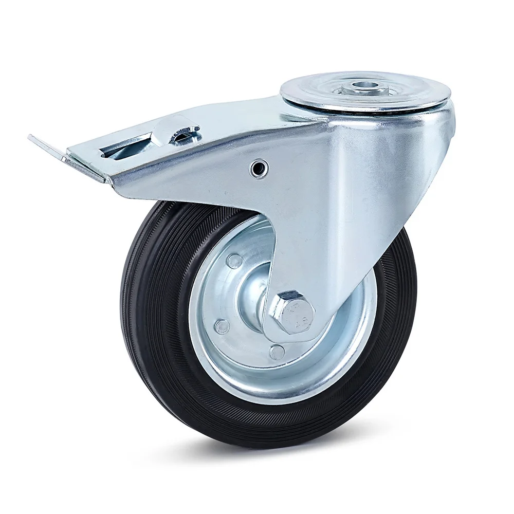 Detta svängbara gummihjul med broms har ett centralt hål, så detta hjul kan enkelt fixeras med 1 bult eller expander.