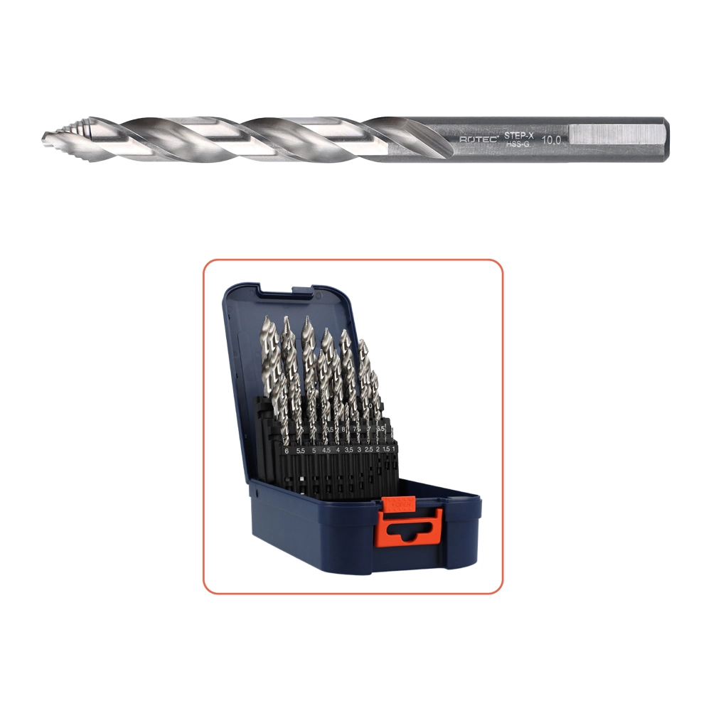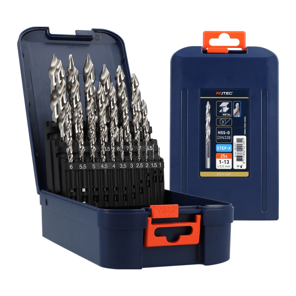 Denna HSS-G spiralborrsats STEP-X består av 25 delar och levereras i en praktisk ABS-låda. Satsen består av borr med diametrar från Ø1 till 13 mm, med en ökande skala på 0,5 mm vardera. De uppfyller DIN 338-standarden och har en slipad yta och ett cylindriskt skaft. Dessa borr ger möjlighet att arbeta utan förborrning och säkerställer perfekt centrering, även på runda ytor, tack vare den självcentrerande delningspunkten med en toppvinkel på 118°. Den unika steggeometrin (från Ø3 mm) gör det upp till 50% snabbare att borra perfekt runda hål i tunnväggiga produkter och plåt. Borrarna från Ø5 mm har dessutom en 3-ytors hållare för optimal fastspänning i chucken. Dessa spiralborrar är idealiska för användning i sladdlösa verktyg och för (extremt snabb) borrning utan tryck, vilket resulterar i gradfria resultat. De är lämpliga för applikationer i stål, aluminium, plast och lövträ. Satsen är utformad för hög precision och längre livslängd, vilket gör att dessa borrar utmärker sig för mångsidig användning även i material som olegerat och legerat höghållfast stål (< 1.000 N/mm²), gjutjärn m.m.