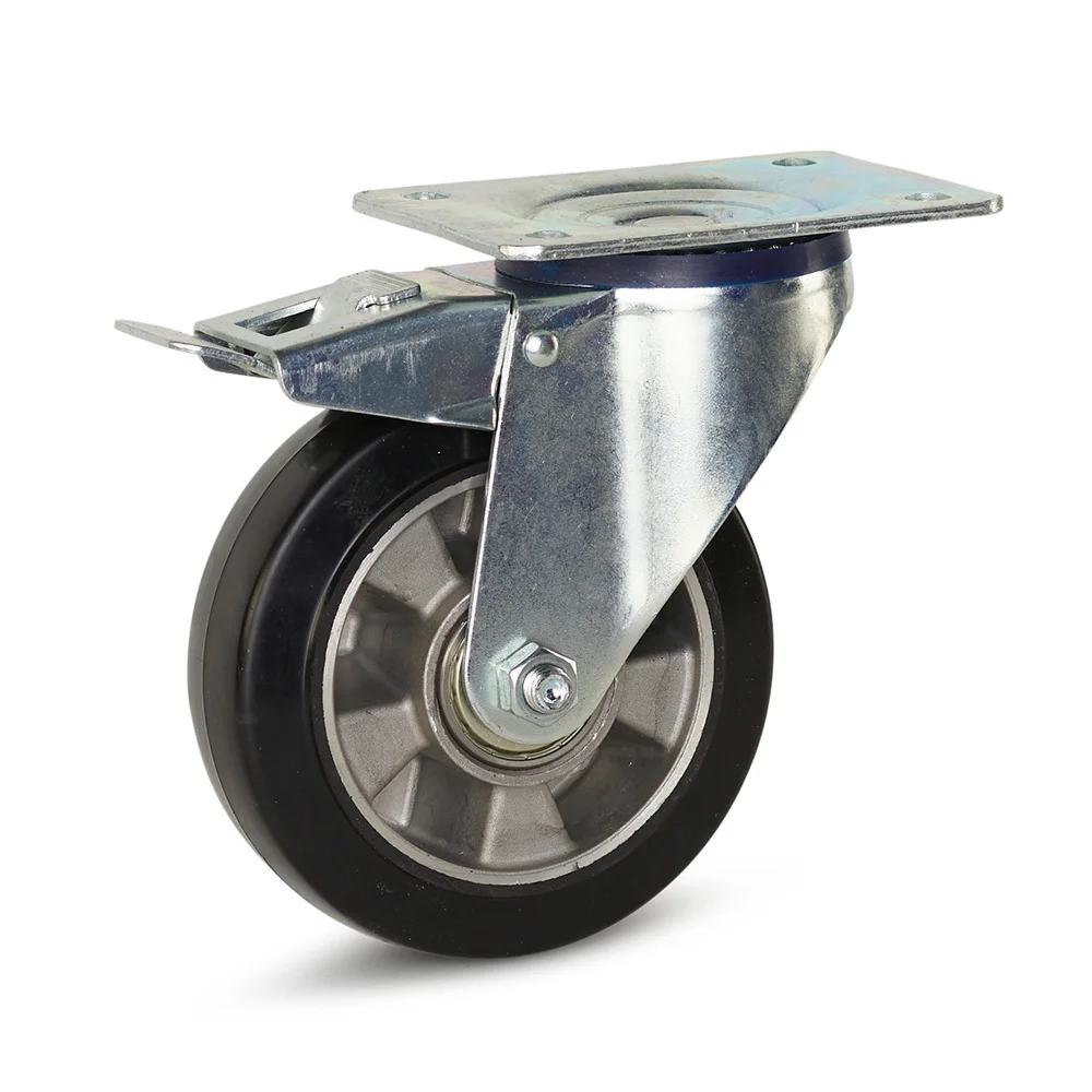 Svart elastiskt gummi svängbart hjul bromsat med topplatta - 150mm - 330kg